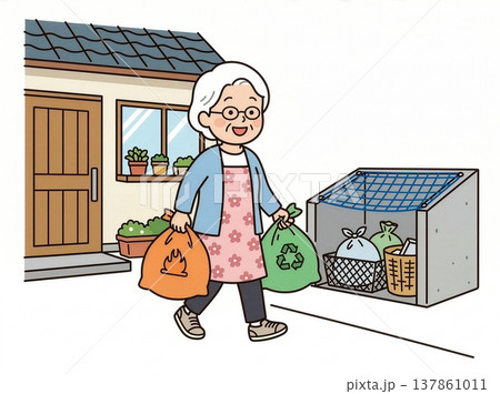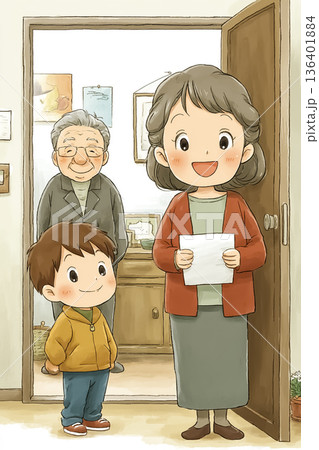 祖母と孫を母親が見守る家庭イラスト|世代をつなぐやさしい日常シーン