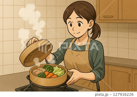 せいろで料理をする自炊中の女性