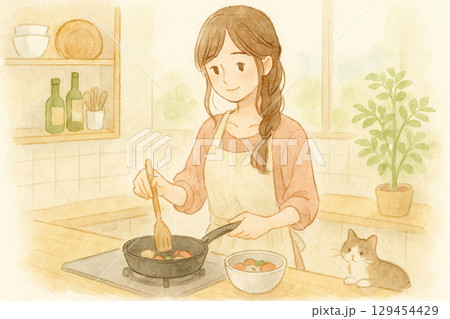キッチン 料理 女性 猫 水彩イラスト 背景あり