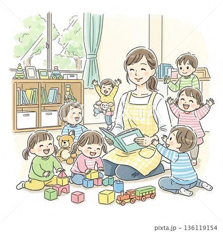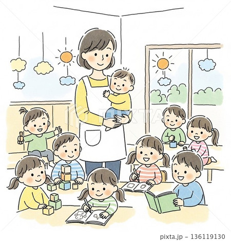 美優シリーズ:母親に抱かれて笑う幼児|家族の愛情と安心感を伝えるイラスト