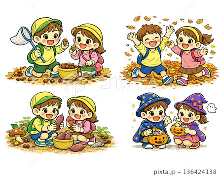 秋の落ち葉の中を笑顔で歩く幼稚園児たちの水彩イラスト