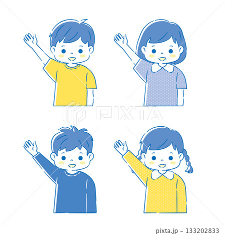 4人の子どもたちが元気に手を挙げているイラスト素材