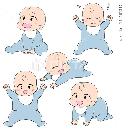 水彩で描いたハイハイや遊ぶポーズの赤ちゃんセット