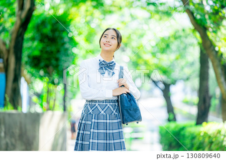 スクールバッグを肩にかけて歩く笑顔の女子高校生