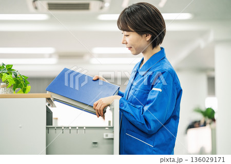 オフィスでファイルを片付ける作業服姿の若い女性