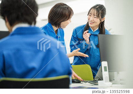 オフィスで同僚と話し合う作業服を着た若い女性
