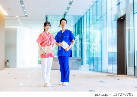 病院の廊下を歩く笑顔の医師と看護師 医療チーム 信頼 全身