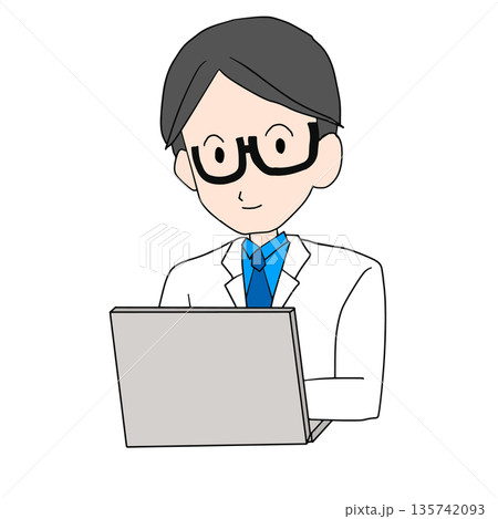 ノートパソコンを持つスクラブに白衣姿の男性医師イラスト