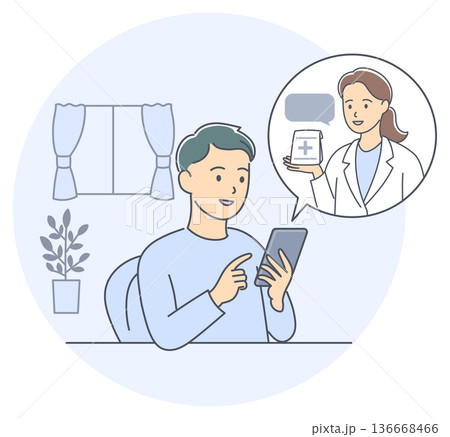 オンライン診療:スマートフォンから応答する男性医師 セット