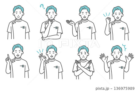 接骨院、介護現場で働く男性。スクラブを着た男性施術者のジェスチャー素材。ベクターイラストセット。