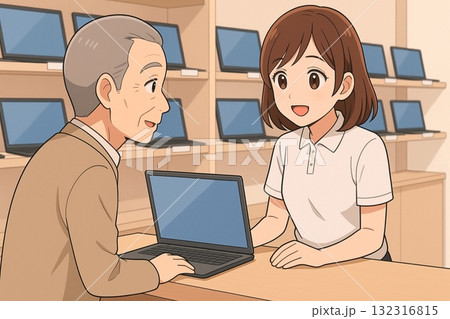 高齢者にパソコンを案内する女性スタッフ アニメ風イラスト