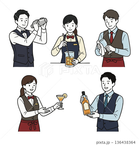 バーテンダーの仕事とカクテル調理の動作イラストセット