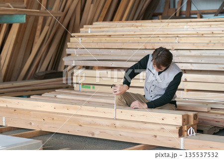 建設現場で木材を測る大工職人の後ろ姿とリアルな作業風景