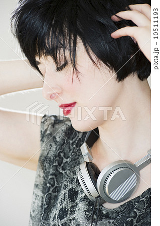 Blond woman listening to music with headphones