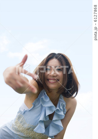 青空の下でポーズをしている笑顔の女性