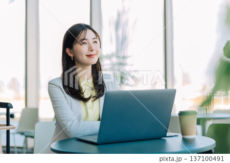 カフェでパソコンを使うオシャレなミドル女性