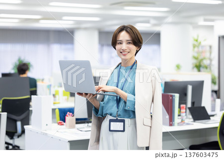ノートパソコンを片手に抱える若いスーツを着た女性