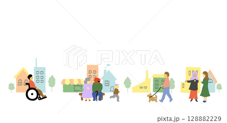 いろいろな人々がいる街並みのかわいい手描きイラスト