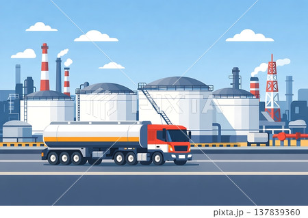 石油精製所前に並ぶタンクローリーと作業員たちの産業物流イラスト