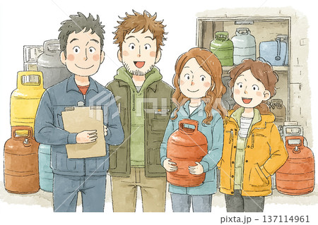 ガスボンベを扱うスタッフと家族|地域インフラと安全管理のイメージ