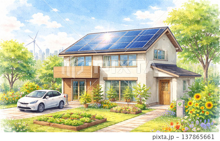 太陽光発電パネルのある住宅と環境に優しい暮らしイメージ