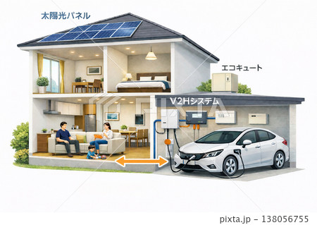 電気自動車と太陽光発電住宅をつなぐV2Hのイメージイラスト