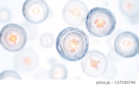 再生医療をイメージした幹細胞と細胞分裂の顕微鏡ビジュアル、皮膚再生・バイオテクノロジー研究