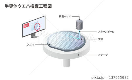半導体ウエハ検査工程図 欠陥検出とスキャン検査装置の模式図