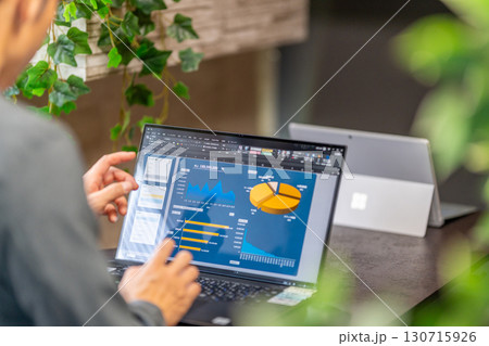スマホとノートパソコンを操作する女性、ビジネスシーン、スマホで検索するイメージ、ネットワーク