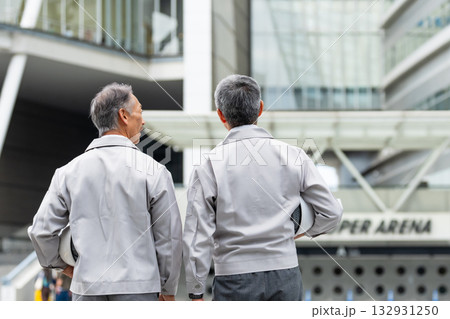 オフィスビルの中に立つ胸に手を当てる2人の作業員 撮影協力:スカパー東京メディアセンター