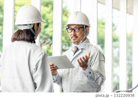現場監督と作業員のデジタル施工ミーティング タブレット確認 フルハーネス