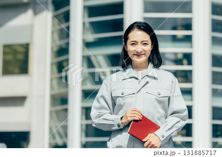 建設現場や工場で働く作業員のイラスト 作業服を着てヘルメットを着用した女性
