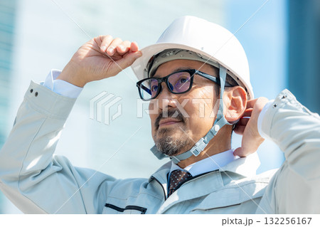 運搬作業のブロックと作業着を着たミドル男性ビジネスマン