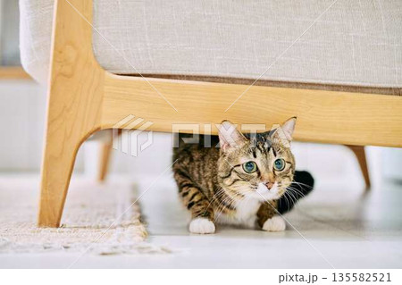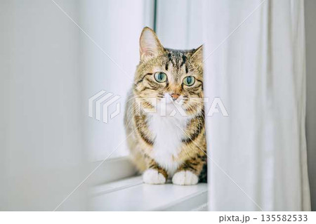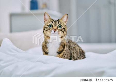 明るいリビングでくつろぐペットの猫