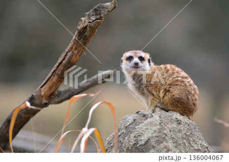 枯れ木と会話をしたいが返事が得られないミーアキャット