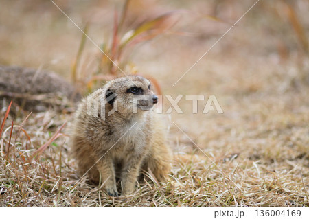 秋の夕陽を受けながら仲間の行動を見守るミーアキャット
