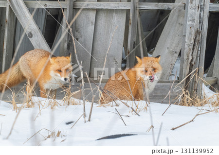 雪の降り積もる郊外の一軒家と野生のキツネ