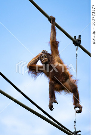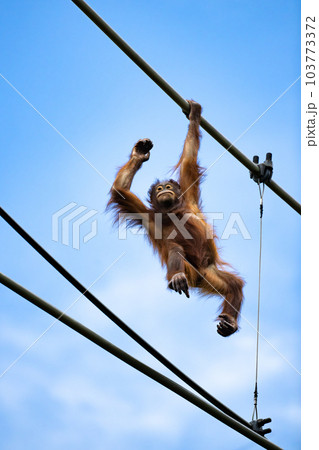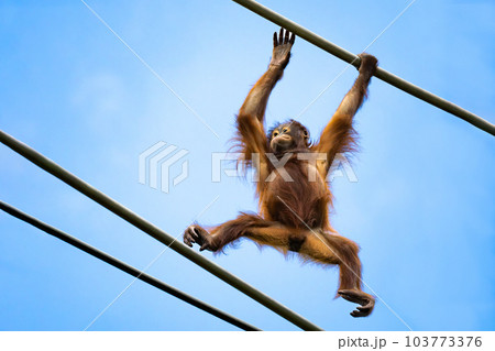 綱渡りするオラウータンの様子 インドネシア・バリ島