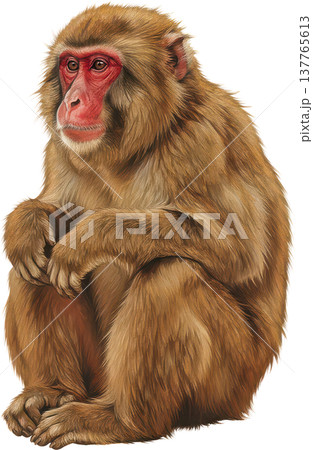 座って物思いにふけるニホンザルのリアルなイラスト
