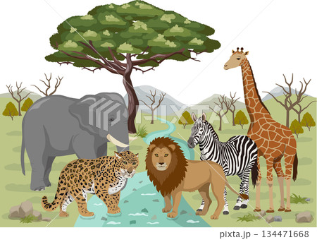アフリカの動物イラストセット(ゾウ、キリン、サイ)
