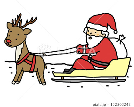 ソリを引くトナカイとソリに乗るサンタクロース 手描き
