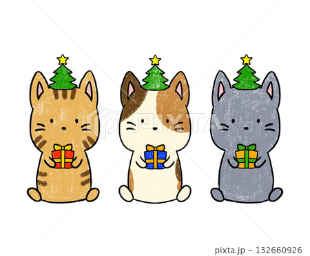 クリスマスプレゼントを持ったネコの手描き風イラスト