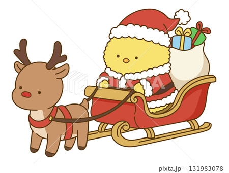 トナカイのそりに乗ってプレゼントを運ぶひよこサンタ