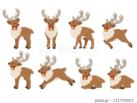 クリスマスリボンとベルをつけたトナカイのかわいいベクターイラスト素材セット