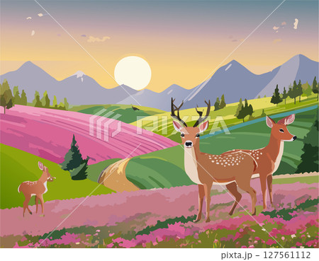 Illustration of a serene wilderness scene natural landscape featuring a herd of deer silhouetted against a vibrant orange sky. The background displays layered mountains in varying soft green and gray