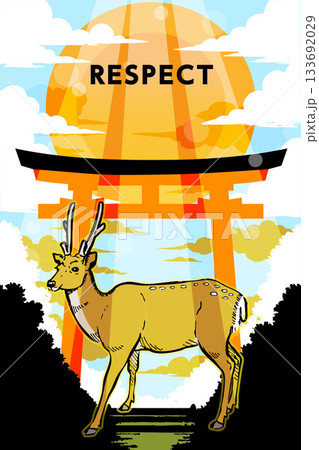 日本の神社の鹿へ敬意を払うための神々しい和風イラスト
