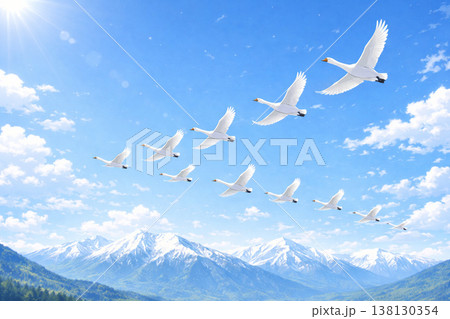 青空 白鳥 群れ 渡り鳥 フォトリアル