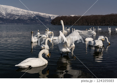 屈斜路湖の白銀世界と白鳥の羽ばたき