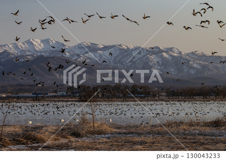 餌場に群れる 越冬するコハクチョウとカモ類 深谷市 旧川本地区