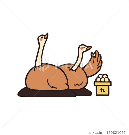 見上げているダチョウと団子を食べているダチョウのカラーイラスト